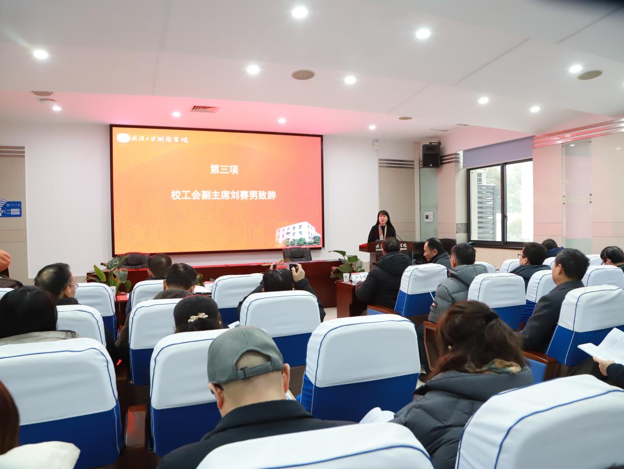 校工会副主席刘赛男在讲话中对学院工会工作给予积极评价。她充分肯定了学院师生在学校各项文体与竞赛活动中取得的优异成绩,以及学院工会在服务学院发展大局中所发挥的积极作用。围绕下一步工作,她提出三点希望:一是坚持党的领导,把稳工会工作正确方向;二是健全制度机制,持续深化民主管理与监督;三是聚焦主责主业,紧密围绕学院中心工作,主动为教职工办实事、解难题,切实发挥好工会组织暖人心、聚人心的作用。