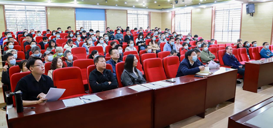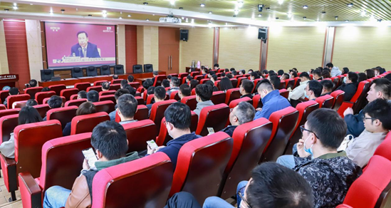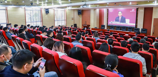 2021年11月12日上午10:00,学院党委组织师生党员,集中观看关于党的十九届六中全会精神的新闻发布会直播。党委委员、教职工党员、学生党员代表、离退休党员代表近100人参加了现场直播的集中观看活动。