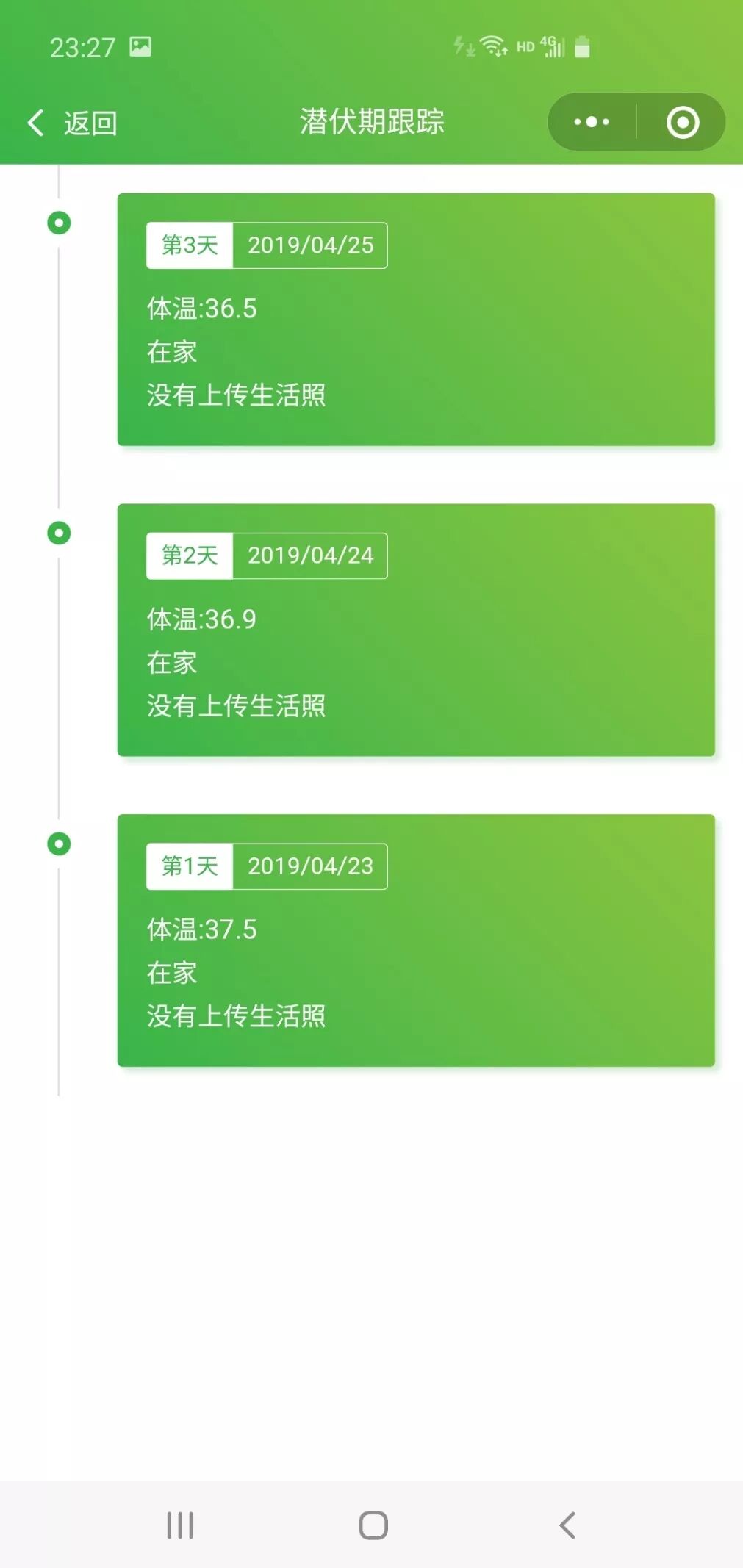 潜伏跟踪:监督约束重点观察群体的自我隔离。重点观察群体利用“爱心护航@疫情”小程序,每日上报体温等健康情况,系统自动跟踪每个观察人员的体温变化情况,并提供异常报警和解除观察的建议。