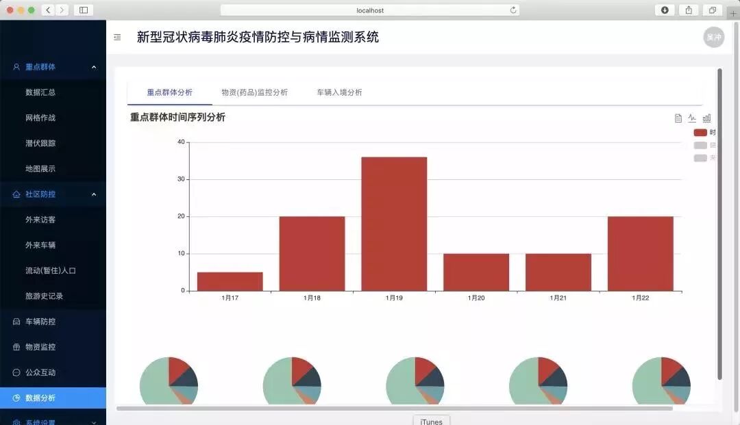 吴冲开发的这款疫情防控与病情监测系统,涵盖重点群体管理、社区防控管理、车辆防控管理、物资(重点药物)防控管理、公众互动、数据分析六大版块,具备数据排查、每日上报、网格作战、潜伏跟踪、地图展示、外来人员与外来车辆检查登记、社区流动人口登记、外地旅居人群登记、出入车辆登记、药品销售登记等实用功能,在疫情数据采集、数据管理和分析等方面提供信息化技术手段。