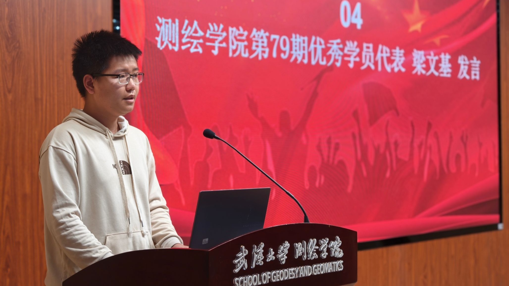 第79期入党积极分子培训班优秀学员代表梁文基发言。他分享了自己参加培训后的收获与成长感悟。他结合线上党课、专题学习、红色实践等经历,讲述了自身对党的认识不断深化,入党动机持续端正的过程。他通过参与向日葵支教队,将“全心全意为人民服务”的宗旨落到实处,以实际行动践行青年担当。